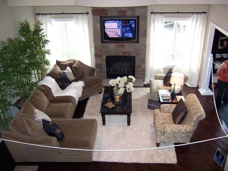 При отдалённом размещении проёмов в пространстве вдоль стен между ними удачно поместятся диван, кресла. При этом места для сидения допустимо расположить прямо под окнами. Если площадь комнаты позволяет, то мягкую мебель лучше сдвинуть ближе к центру гостиной.