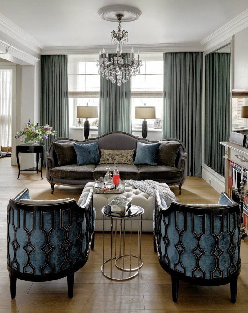 Просмотр фото гостиной с двумя окнами в классическом стиле даст понимание органичности такого решения. Барокко или ампир сделают помещение торжественным, благородным. Комната станет похожей на дворец.