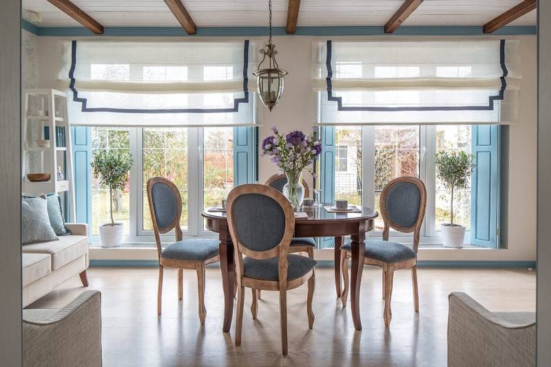 Желательно использовать деревянную мебель и более легкий вариант с коваными ножками. Вместо занавесок на окнах ставни или деревянные жалюзи.