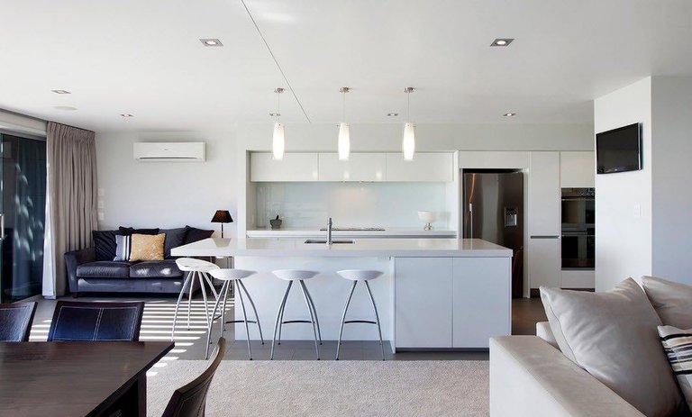 Неброская и светлая гамма зрительно увеличивает помещение. Используют дымчатую, кремовую, бежевую и другую нежную пастельную палитру. Стильная кухня-гостиная в белом цвете всегда смотрится свежо и воздушно. Благодаря разнообразным вариациям белоснежных оттенков можно сделать дизайн более интересным.