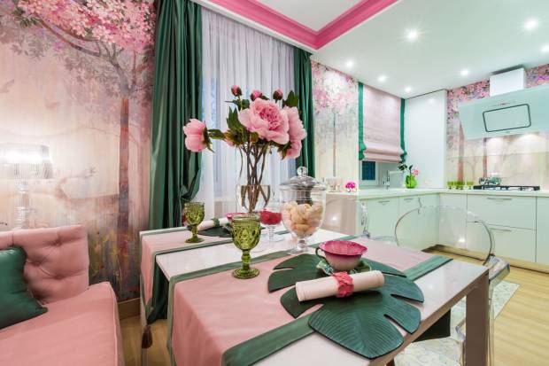 На фото кухня-столовая с яркими стенами, окрашенными в розовый цвет.