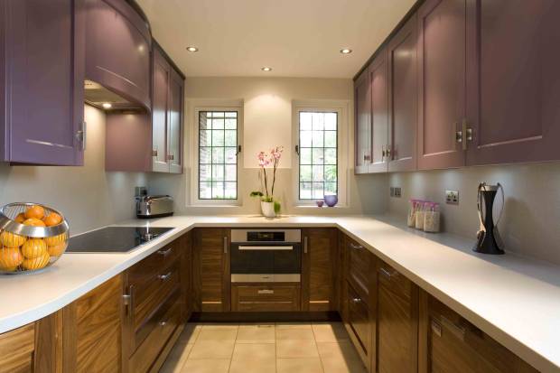 Желательно использовать холодные светлые оттенки и незначительные яркие вкрапления. В кухнях большой площади комбинируйте темные тона средней насыщенности и яркие оттенки. Кухонную мебель в данном случае сделайте двухцветной.