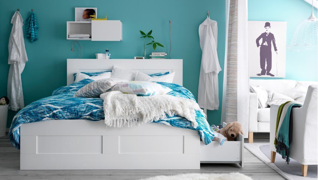 Традиционно к мебели для спальни мы относим кровать – куда же без нее, тумбочки, гардероб, комод, туалетный столик, банкетку. В современных интерьерах прочные позиции занимает телевизор, а в некоторых прекрасно приживаются компьютерные столы со всеми причитающимися приложениями. Как же гармонично разместить все это в одной небольшой комнате? Цвет мебели определяется на стадии разработки дизайна в зависимости от окраски стен и текстиля. На фоне белоснежной кровати бирюзовое покрывало будет смотреться роскошно, а сама она не сольется с аквамариновой стеной.