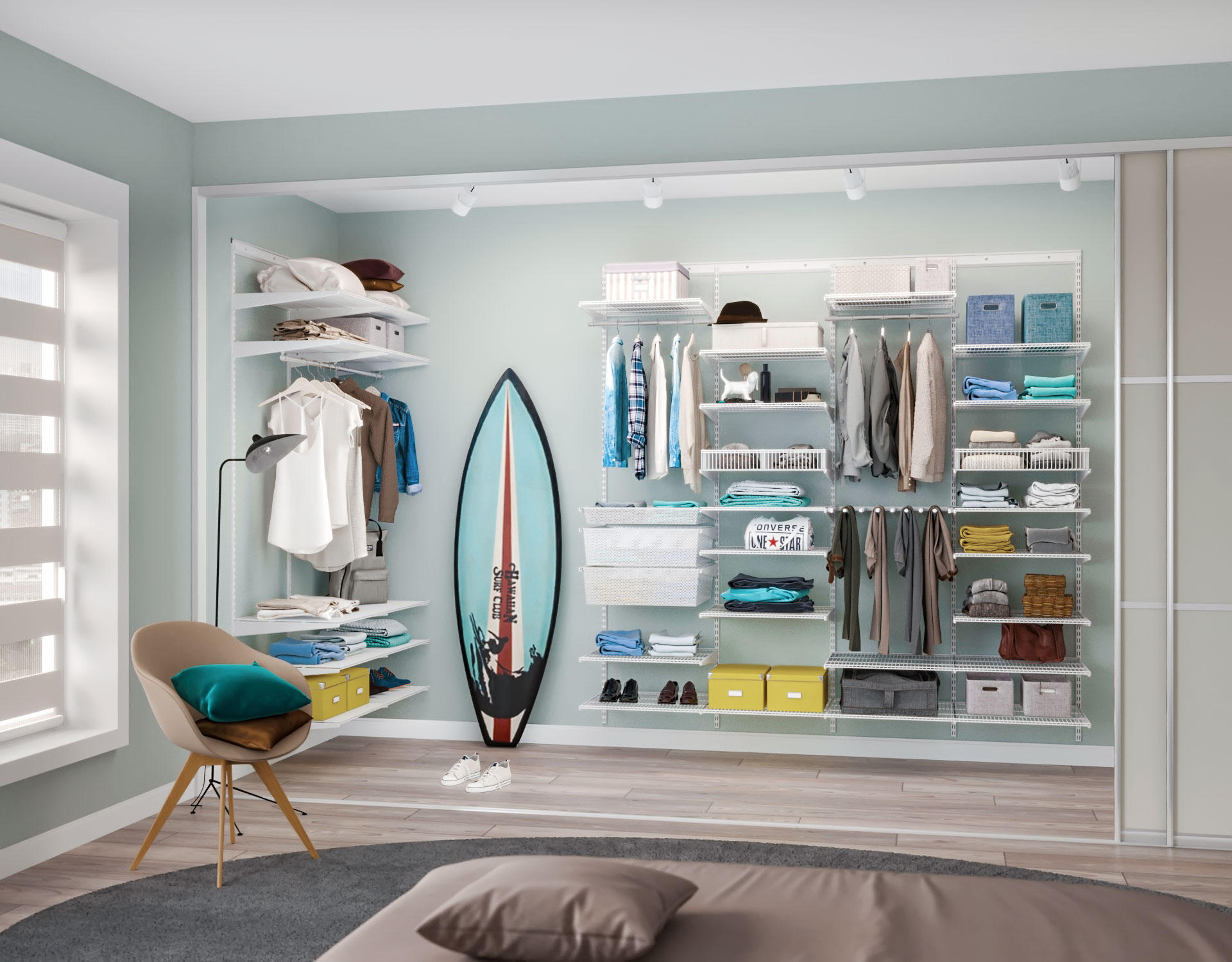 Некоторым нравится созерцать свои наряды, аккуратно развешенные и разложенные по сезонам и оттенкам. Открытый тип гардеробной – наиболее приемлемый для спальни, в которой мало места, чтобы перегораживать ее или зонировать.