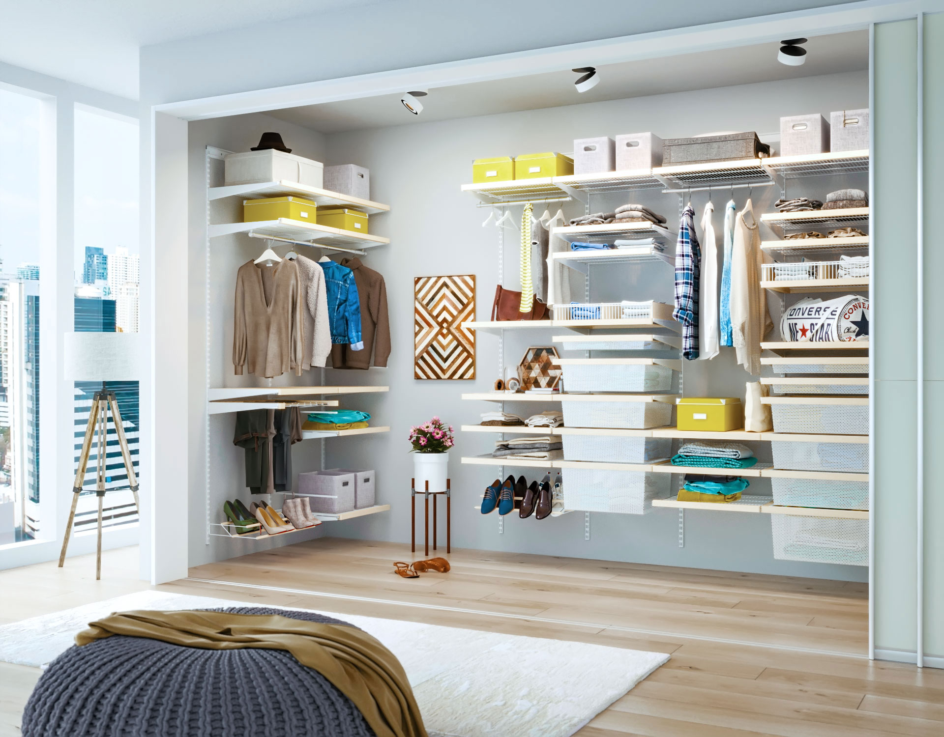 Важно продумать освещение, если нет окна. Если под помещение для одежды решено выделить внушительную часть спальни, должны быть продуманы:
