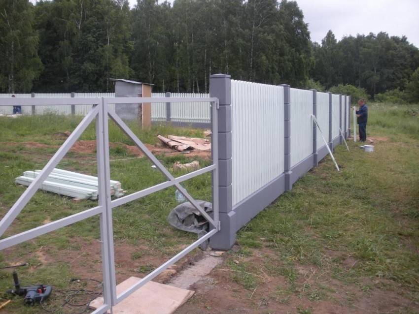 На первом этапе работ, опоры вкапываются в землю на 1,2 м в глубину и бетонируются для получения максимальной прочности. Таким образом возводится весь каркас для будущего забора. После чего крепятся листы с помощью сварки, заклепок и саморезов. Готовая конструкция получается аккуратной, прочной и надежной.
