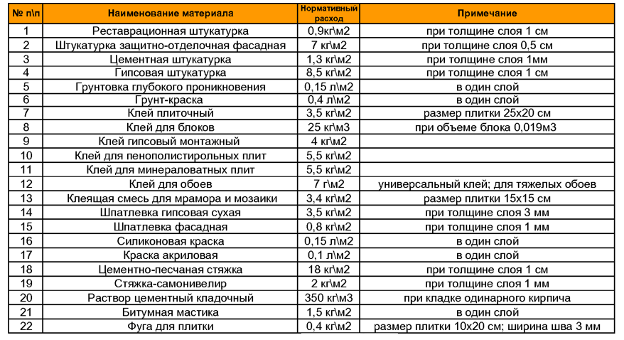 Нормы, как вы понимаете, носят усредненный характер и не всегда учитывают современную технологию производства, подразумевающую использование новых материалов. Ниже предоставляется таблица со справочной информацией по расходу материалов при выполнении популярных общестроительных работ.